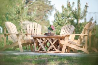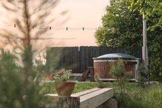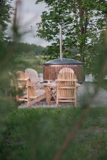 ⎯ Near the cottage, with a view of the river, there is a hot tub with a well-equipped relaxation area - grill, garden furniture and hammocks.