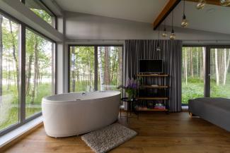 Holiday House Empagi is located in a quiet and remote location on the shore of Lake Lādes, just 80 kilometers from Riga. It is surrounded by a forest with a view onto the lake. The nearest neighbors are half a kilometer away, allowing the guests to enjoy nature without modern-world disturbances. The house is suitable for a couple or a family (up to four people).