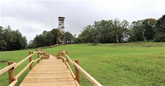 Skatu tornis izbūvēts tajā pašā vietā, kur 20. gadsimta 60. – 70. gados atradās ugunsdzēsēju tornis. Tā ideja un moto ir Sudrabu Edžus tēla Dullā Daukas jautājums, kas ir aiz horizonta un vai zeme ir apaļa. Skatu tornis, pastaigu taka un piemiņas akmens atrodas uz Taurupes un Meņģeles pagastu robežas Ogres upes senkrastā pie rakstnieka bērnības mājām “Zvaniņi”.